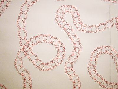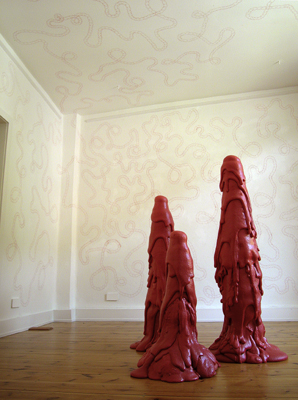 Noch mehr, 2007 Installation in der Galerie Up art Gestempeltes Wandbild und Objekte aus rotem Bauschaum Größe variabel - zwischen 0,70 und 1,20 m hoch