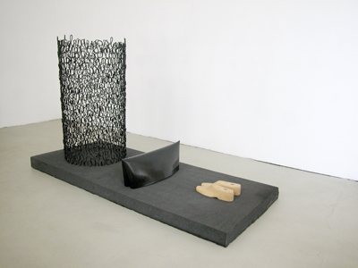 Installation aus einer grauen Schaumstoffmatratze, Schuhleisten aus Holz und einem Objekt aus Faden und Kunstharz