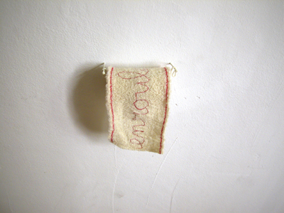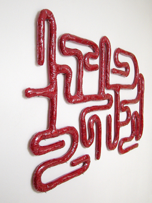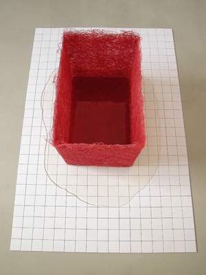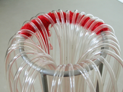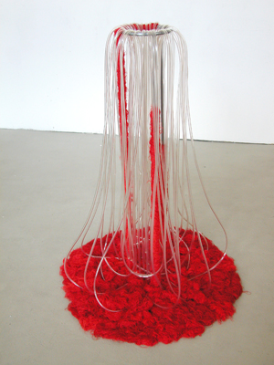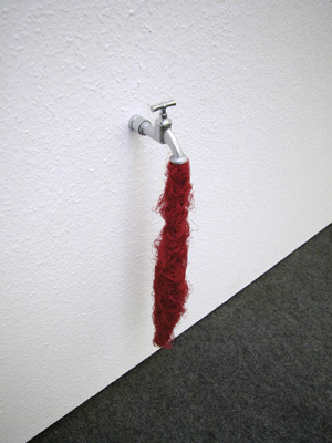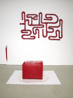Die Installation besteht aus einem Becken aus Fäden und Kunstharz auf Fliesen, (1,20 x 1,40 x 0,50 m hoch), einem Labyrinth aus 115 km rotem Faden, der in Klarsichtfolie eingenäht ist, (1,70 x 1,10 m x 6 cm dick), einem Wasserhahn mit Fäden, einer aufgewickelten Binde mit dem eingenähten Text enrouler, dérouler (aufrollen, abrollen), und einem Objekt aus PVC-Schläuchen und Faden, (1,10 x 0,50 m Ø).