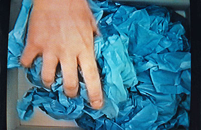2. Ich presse Plastikfolien in eine Schachtel, die sich immer wieder auffalten.
