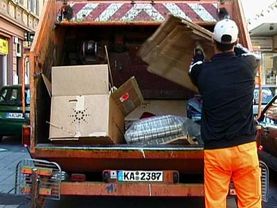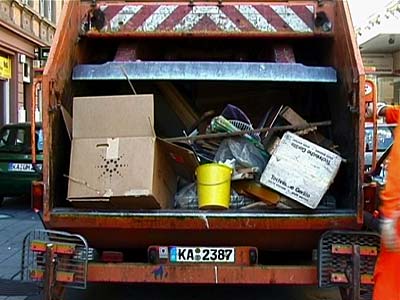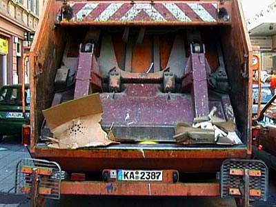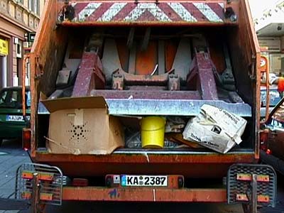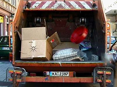Zur schönen blauen Donau wird Spermüll in einen Müllwagen geworfen und gepresst, und in einer Rückwärtsschleife hüpft er wieder heraus.