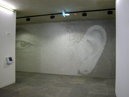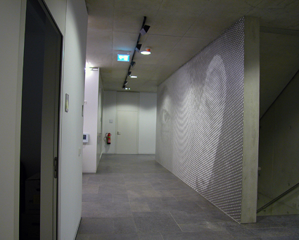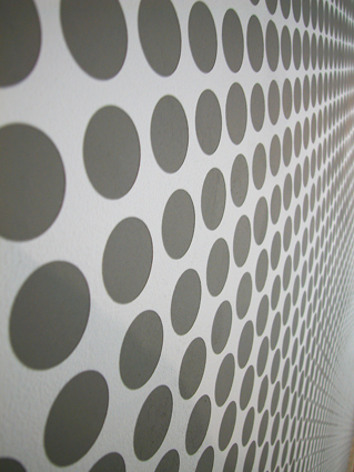 Die grauen Punkte haben mit Hilfe einer Schablone die Farbe und Qualität der Betonwand, die weiße Fläche ist mit Wandfarbe ausgeführt.