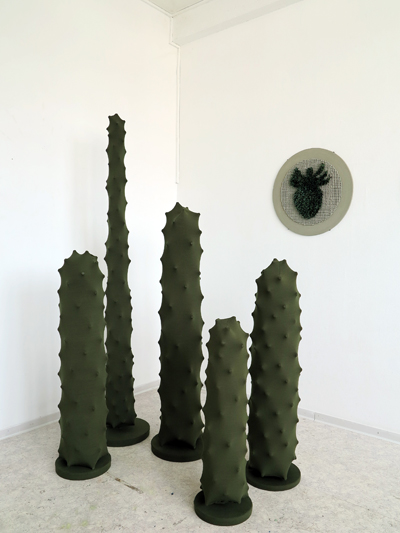 plâtre, terre, bois, herbe synthétique, charnières |